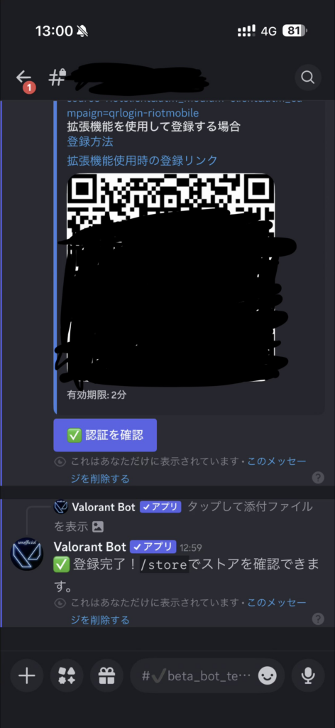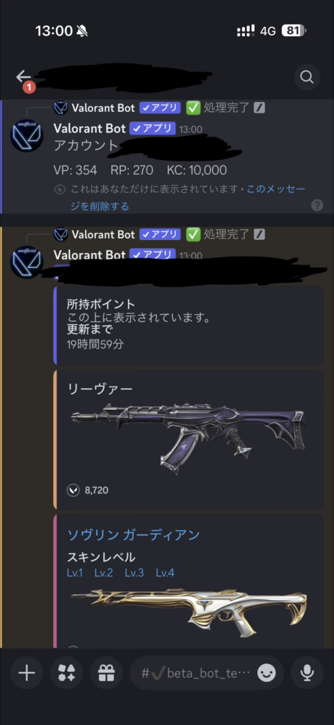 もう一つがValorant Bot Serverこちらのサーバーに一度入り、Botに直接コマンドを送ることでストア情報を確認する方法です。