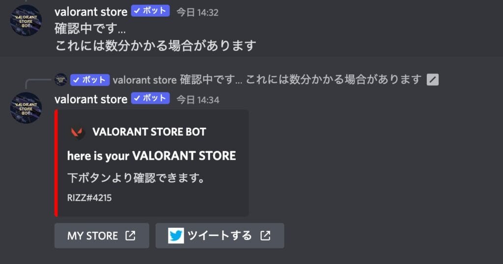 一方で、Valorant Storeは/storeと入力すると数分後に「下のボタンより確認できます。」というメッセージと共にURLが送られてきます。