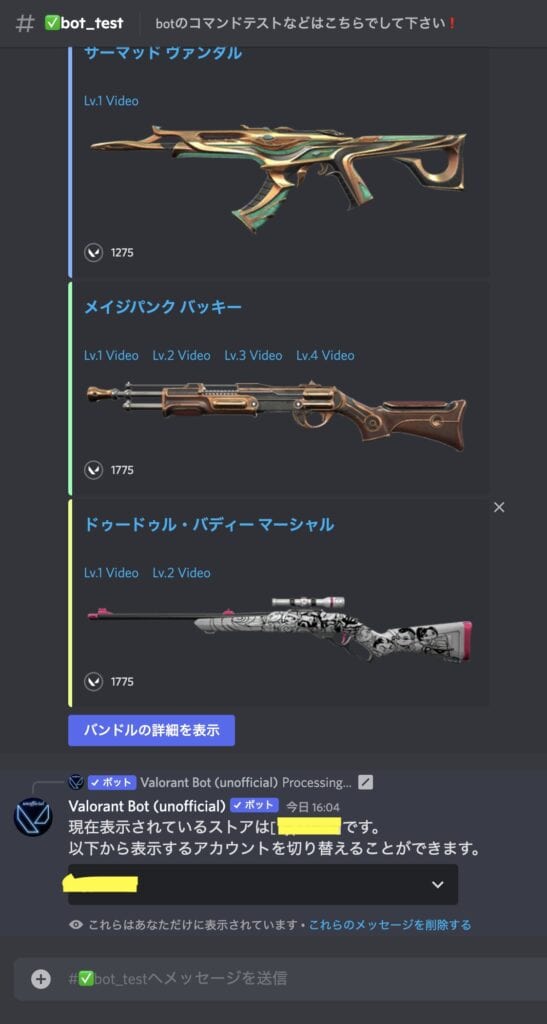 Valorant Botでは/storeを打つと下の画像のようにストアが表示されます。複数アカウントがある場合は下のアカウント一覧から切り替えると、そのストアが表示されます。
